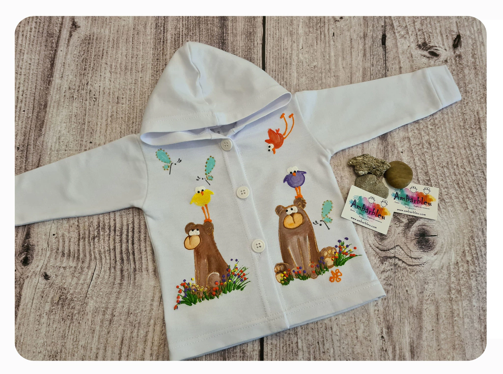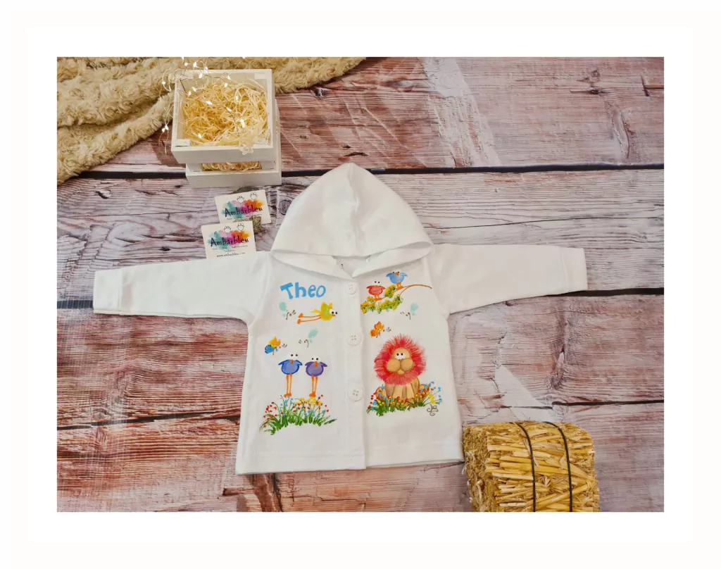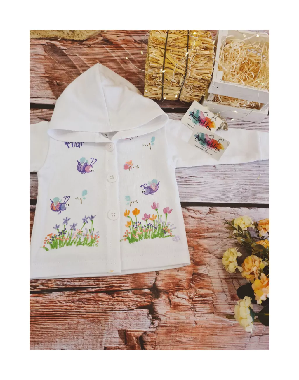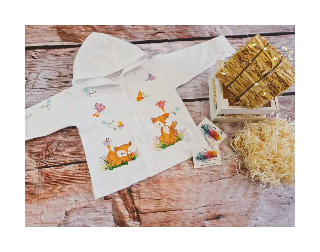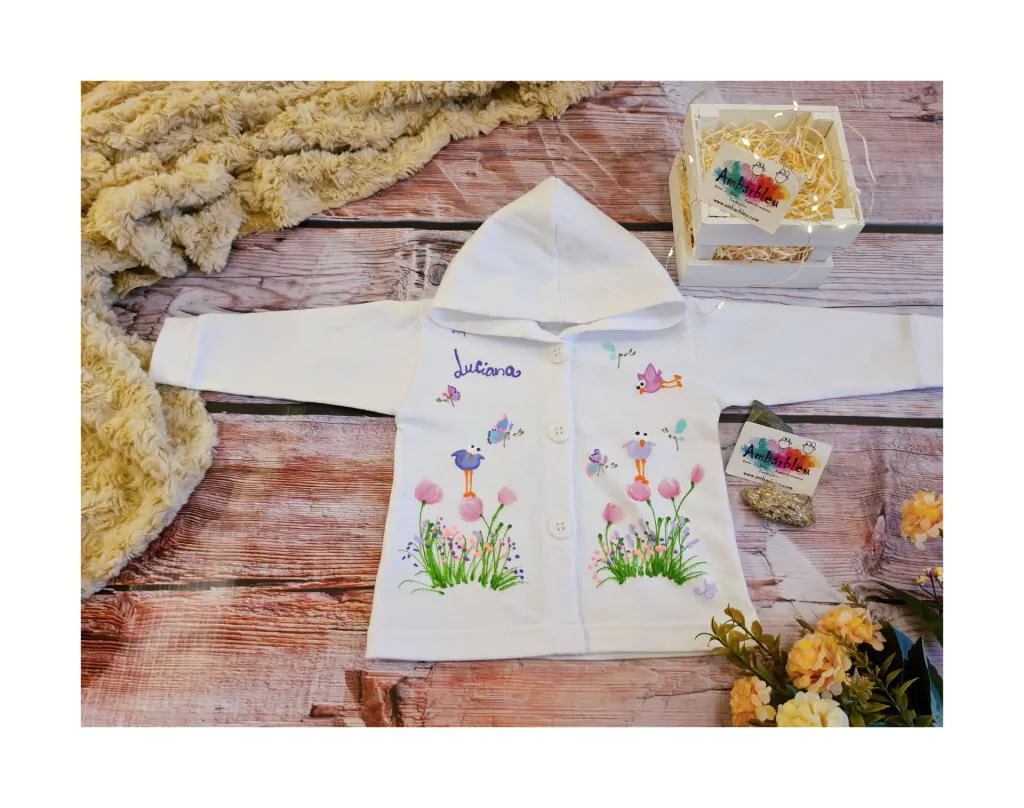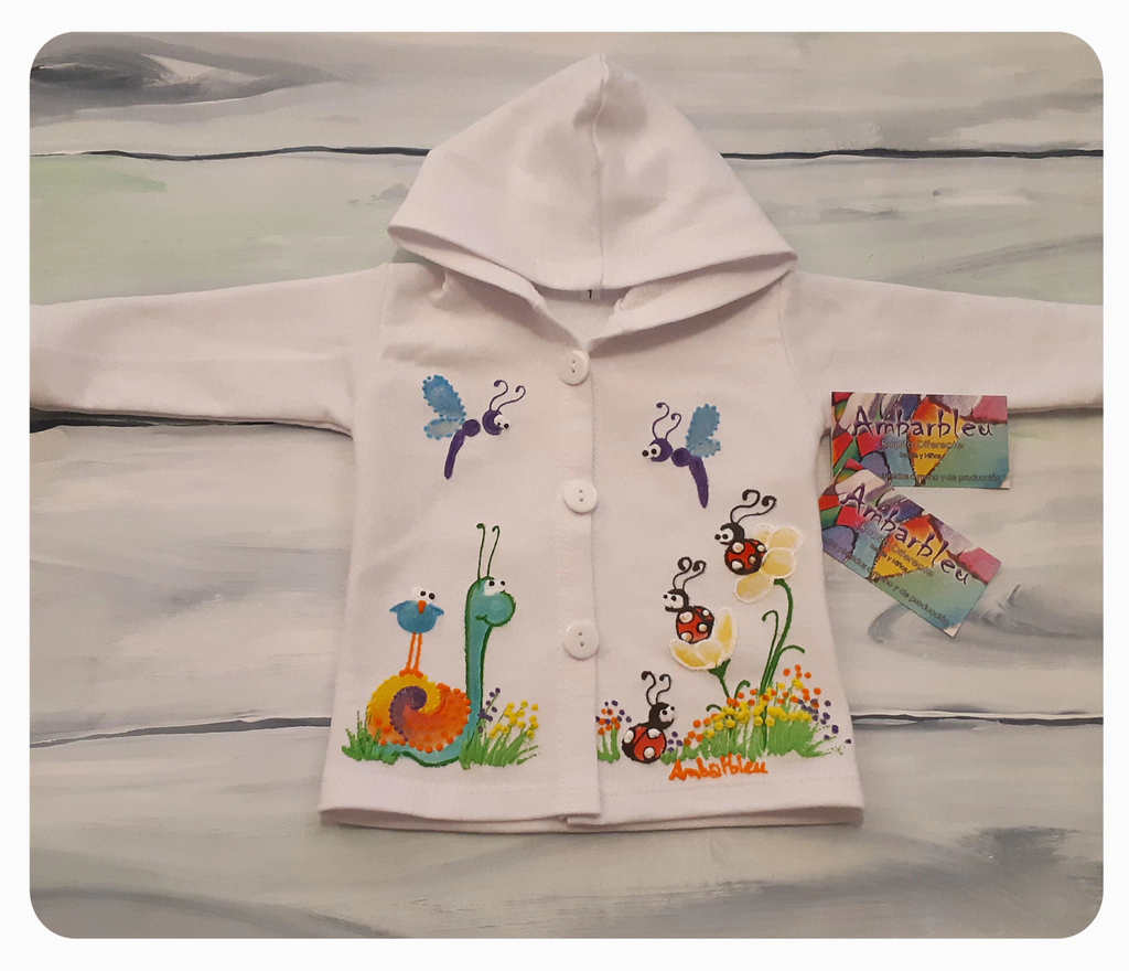 Campera para bebe, de algodon rustico, con capucha y botones.
